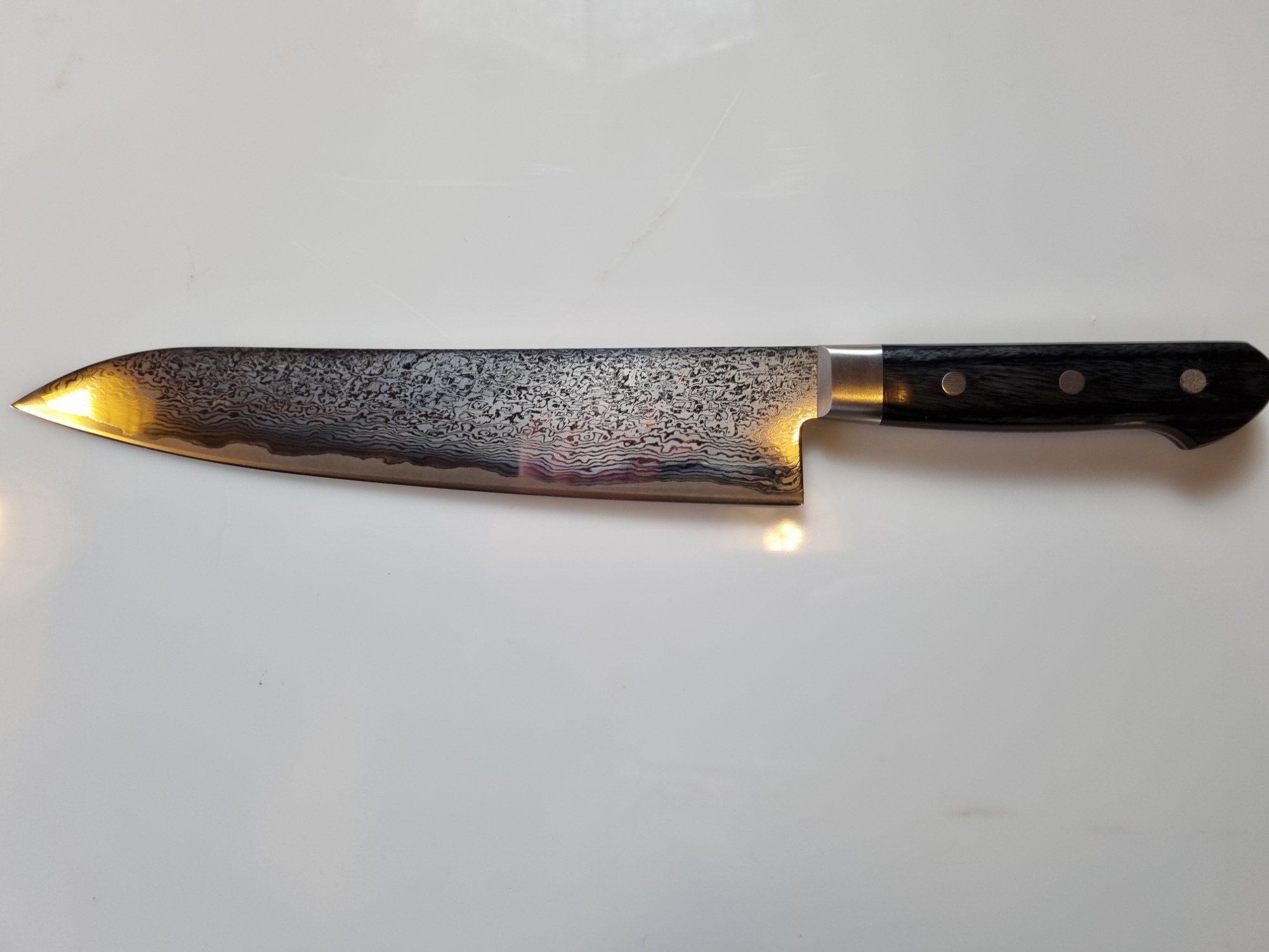 De Sakon Gyuto Nickel damast van 73 laags staat garant voor extreem snijgenot , ook vanwege de hardheid van 64 HRC .Sanmai opbouw met 72 lagen puur Nikkel en SUS410 RVS staal .De kern is van SKD11 staal wat rijk is aan koolstofstaal en vergelijkbaar is met Yazuki Aogami.Het heft is van zwart Pakkawood.